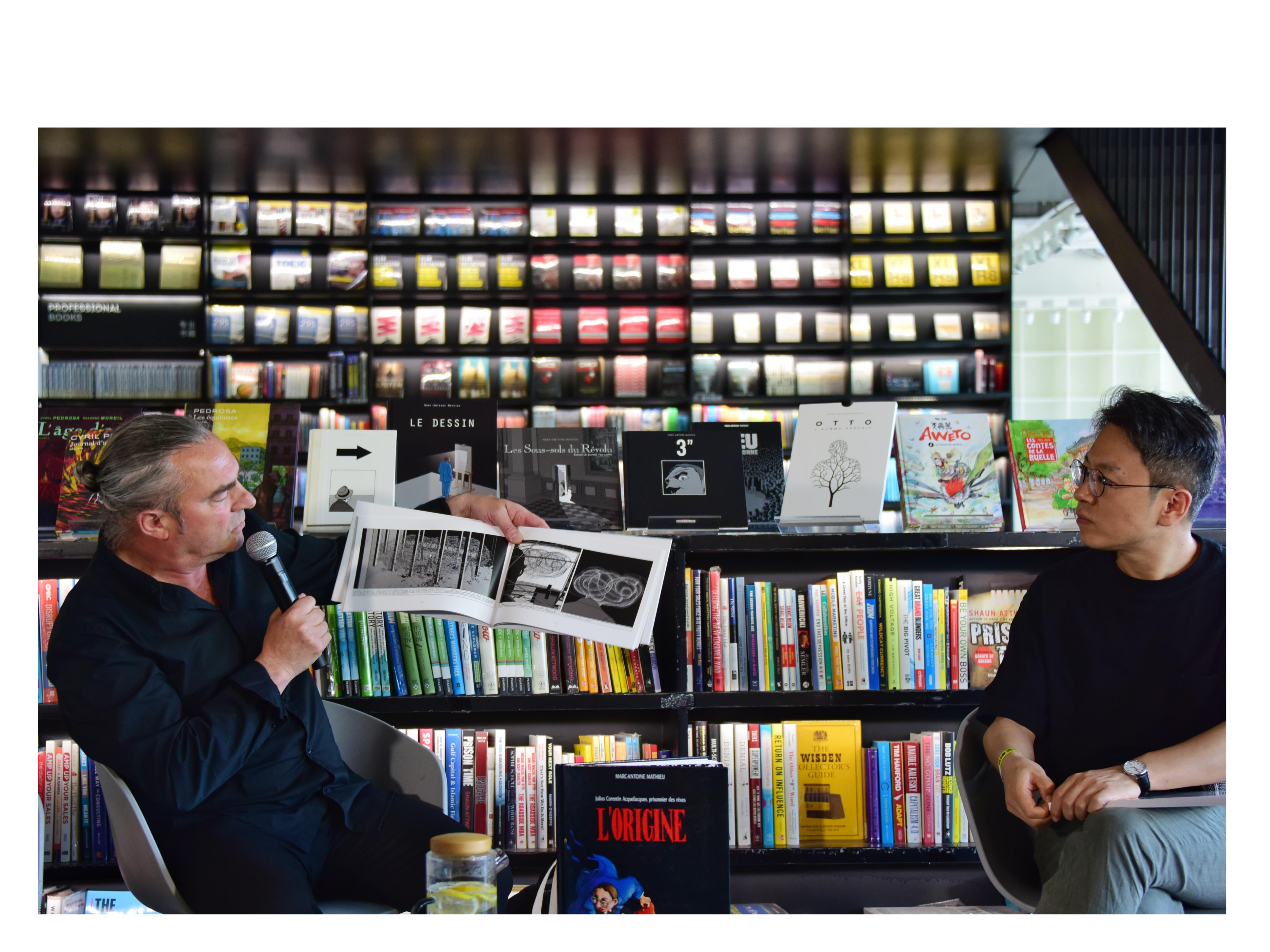 Un entretien entre Marc-Antoine Mathieu, dessinateur et scénariste français de bande dessinée ainsi que parrain de la 8e édition de la Fête des Bulles, et son éditeur Lü Junjun a eu lieu le 1er juin à la librairie PAGEONE (Beijing FUN), dans la capitale chinoise.