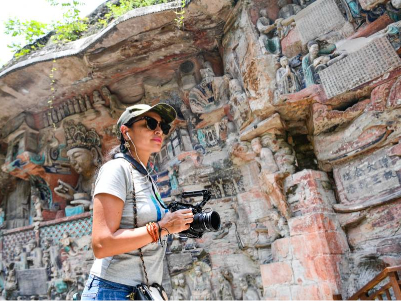 Ecoutant attentivement les explications du guide et prenant des photos, le touriste français Anthony Permaye et ses amis s'émerveillent malgré la canicule devant les sculptures rupestres de Dazu, à Chongqing, municipalité du sud-ouest de la Chine.